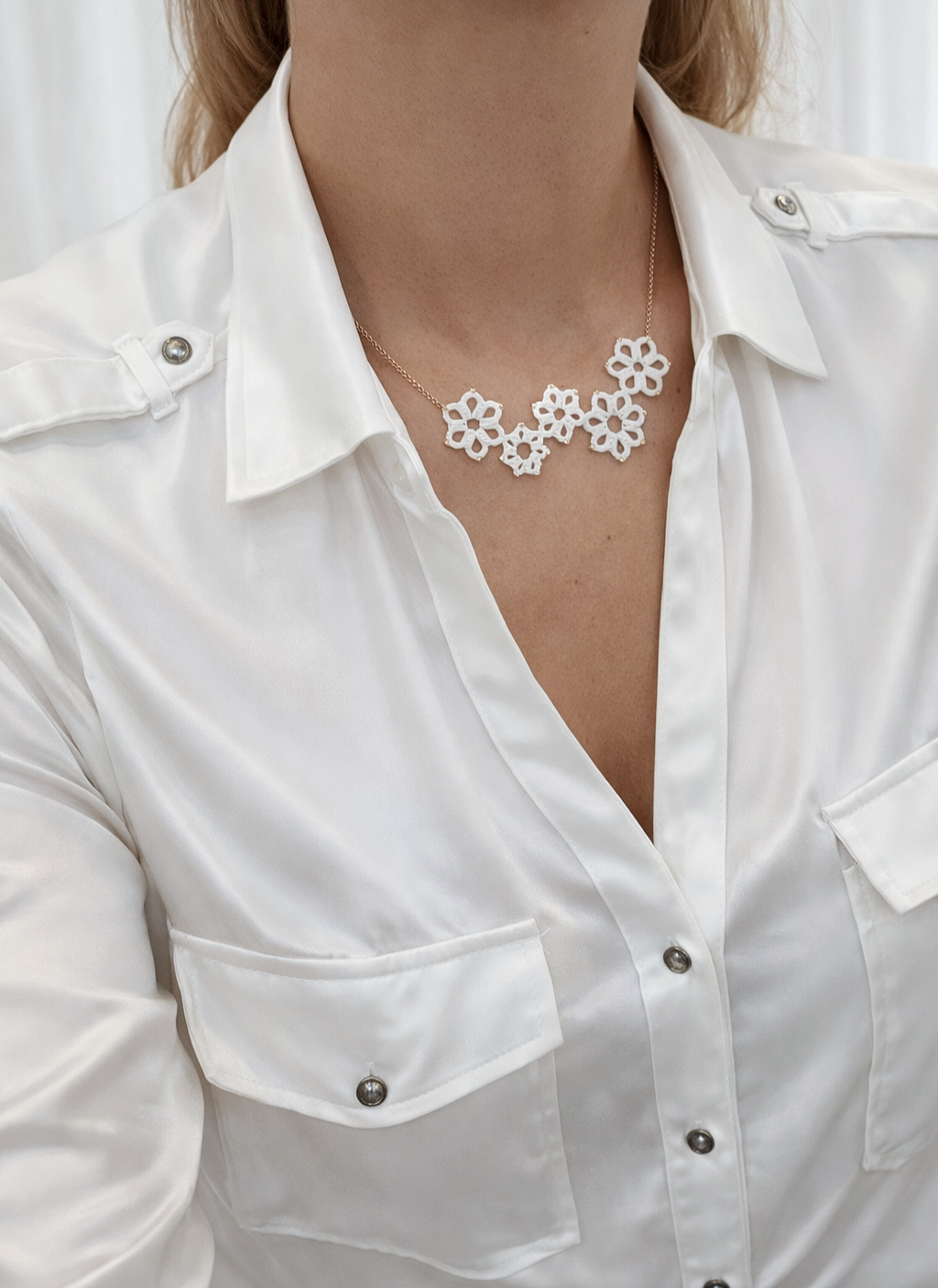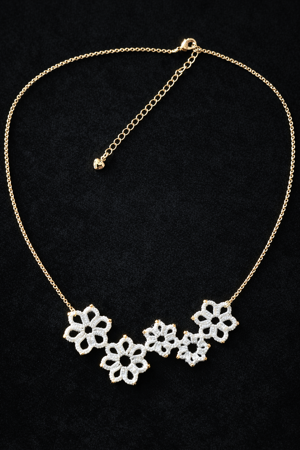 Ravissant collier ras de cou avec ses fleurs en frivolité.