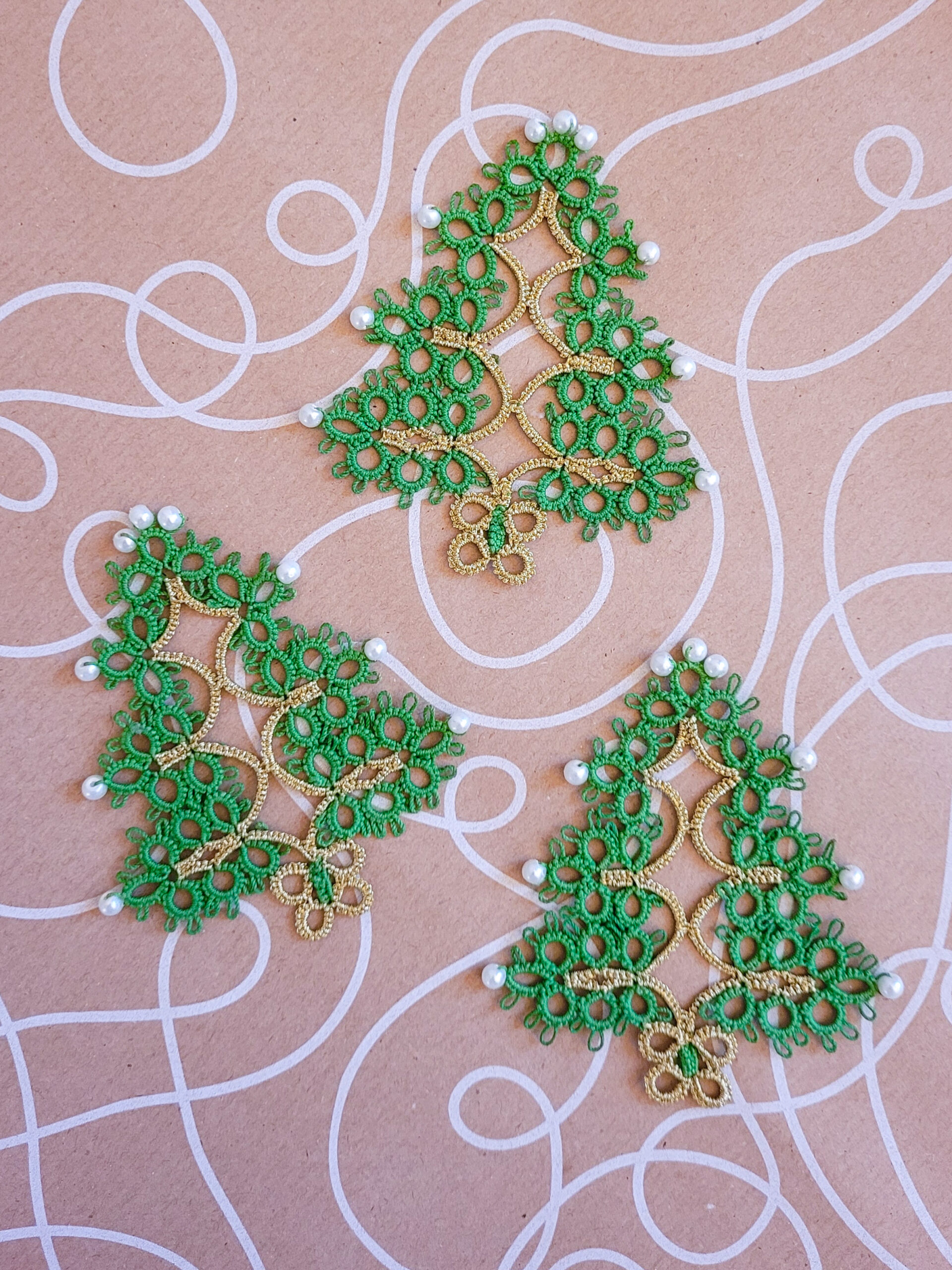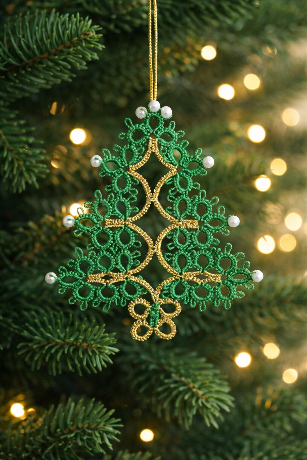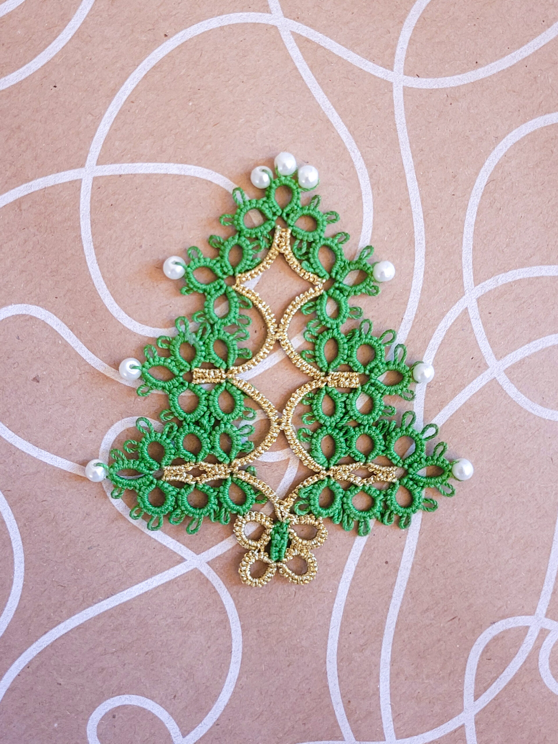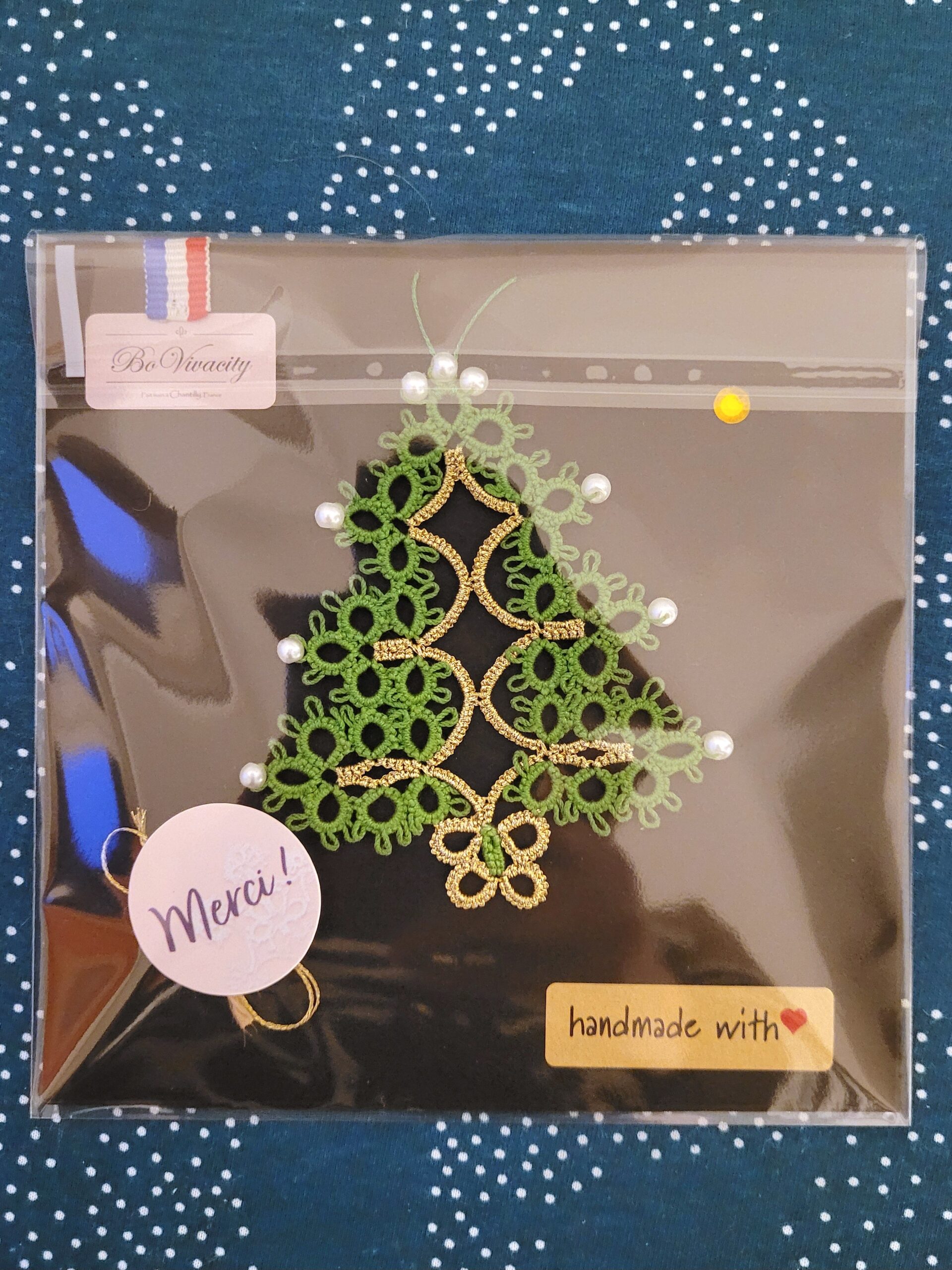 Sapin de Noël en technique de frivolité (dentelle à la navette, tatted lace) fait main à Chantilly, en France. Joli et unique cadeau de Noël et signe d’attention pour vos proches.