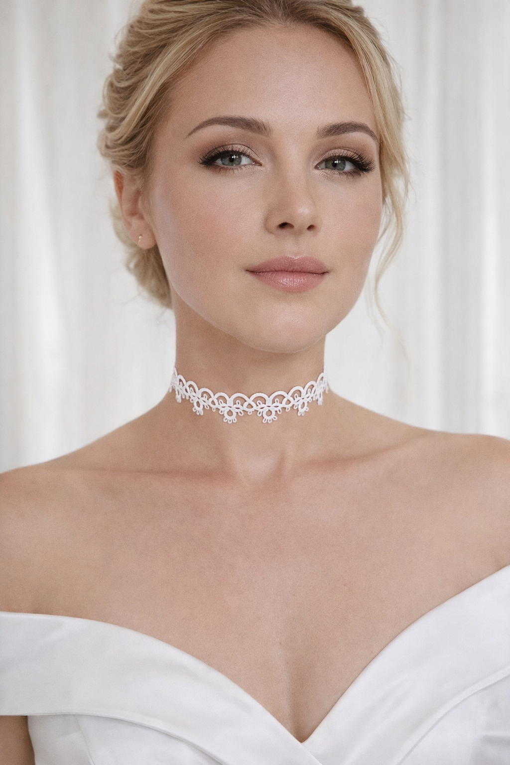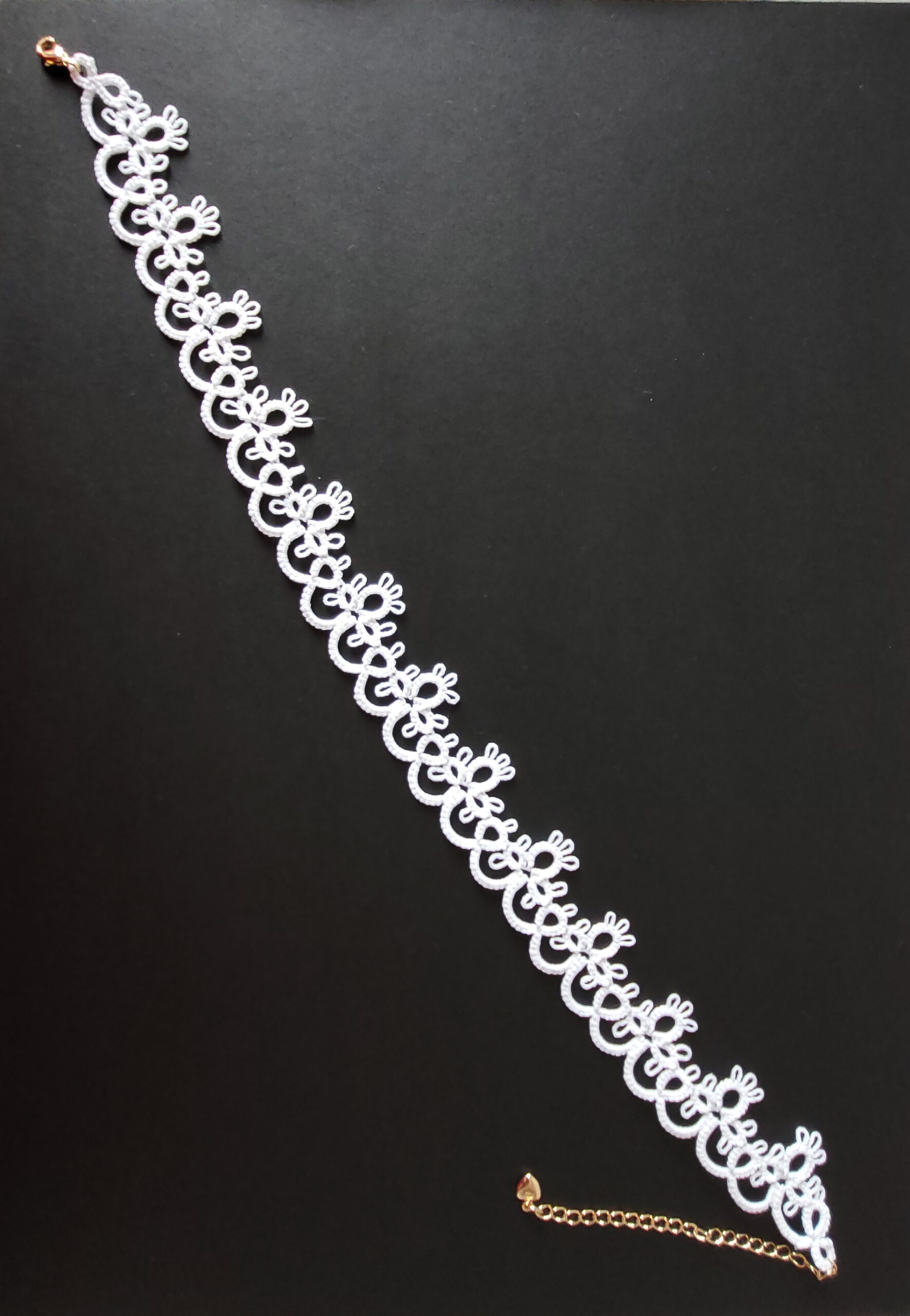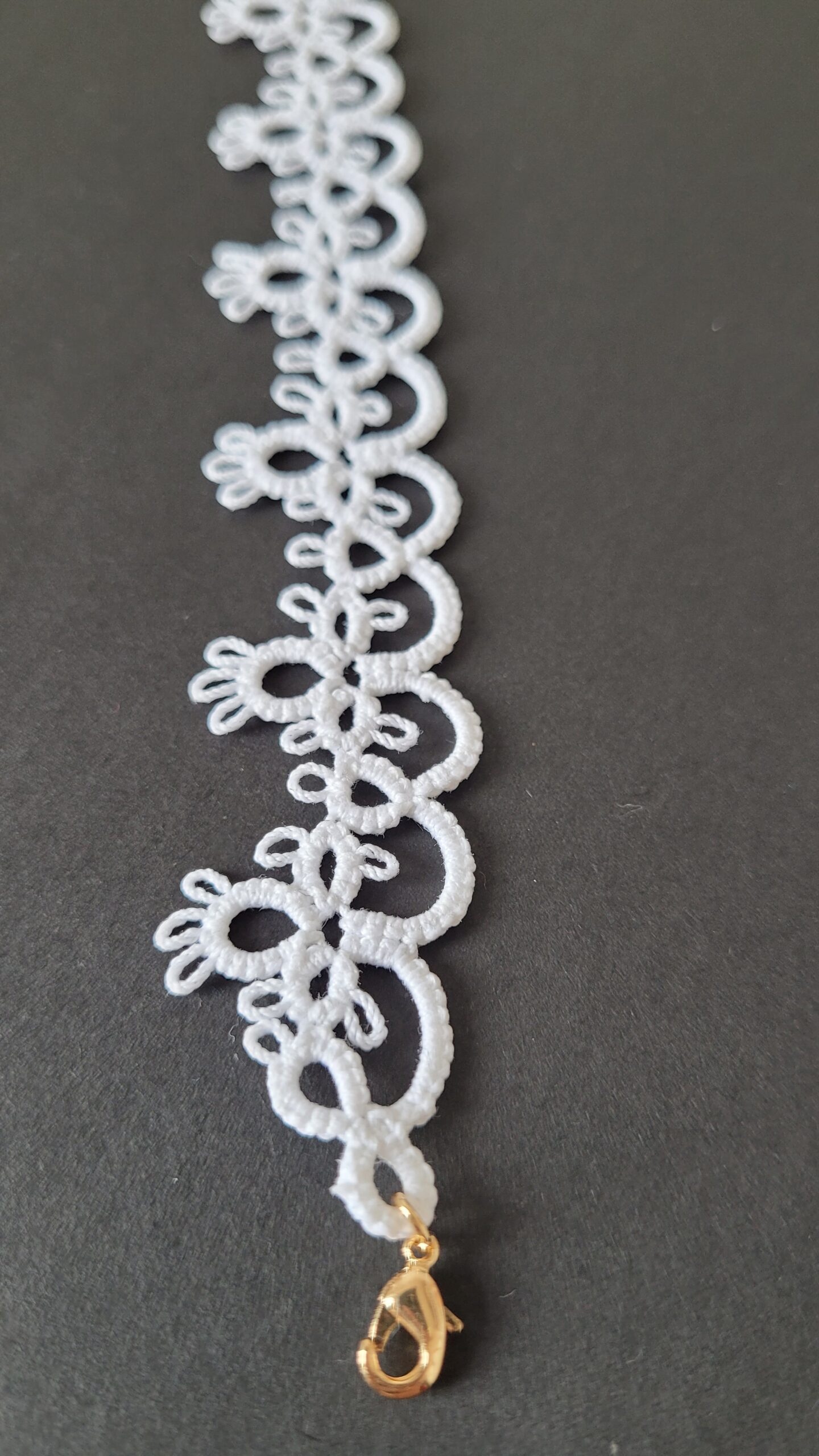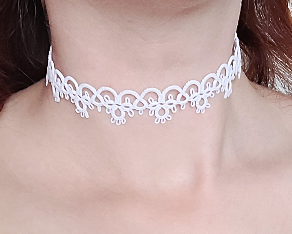 Ras-de-cou en dentelle réalisé à la main selon la technique de la frivolité (tatting). Confectionné en fil de coton apprêté, il offre une bonne tenue et une finition raffinée.